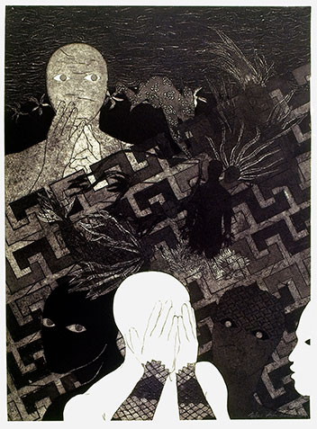 Por su parte, en esta suerte de representación antológica que deviene la exhibición, es notable la inclusión de piezas, que si bien representan la labor individual de cada sujeto en la nómina propuesta; no se conciben como meros ejemplos del paso de los artistas por la galería. Por el contrario, se han presentado trabajos recientes, que corresponden a períodos creativos particulares, alejados de la estadía de dichos actores en el recinto expositivo. De esta manera, es necesario señalar que curatorialmente la muestra se vuelve, por momentos, un tanto inconexa y caótica; lo que resulta de la concertación y el intercambio de diversas cosmovisiones y cargas visuales en un sitio demasiado íntimo para este tipo de interacción. Este hecho provoca que las obras, lejos de yuxtaponerse, se amontonen descalabradamente.