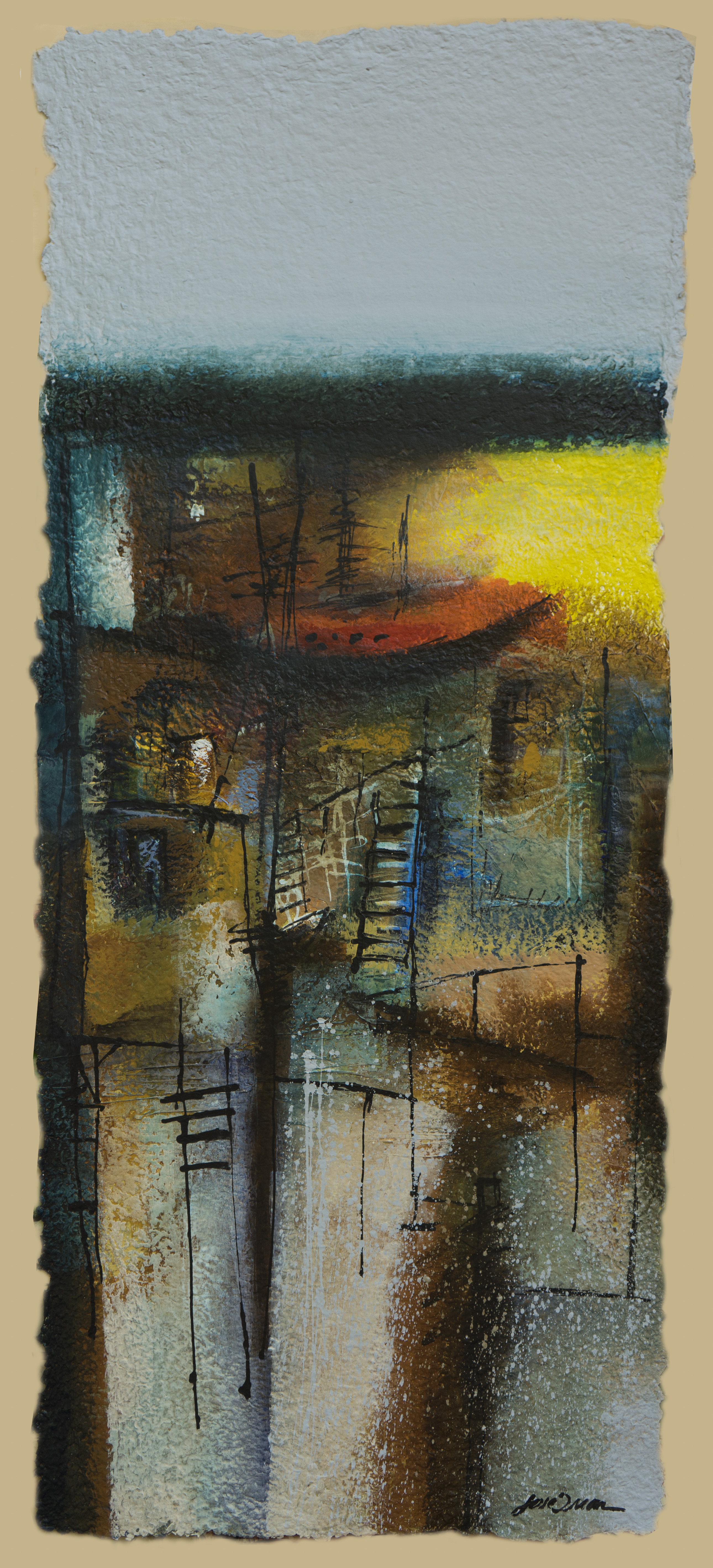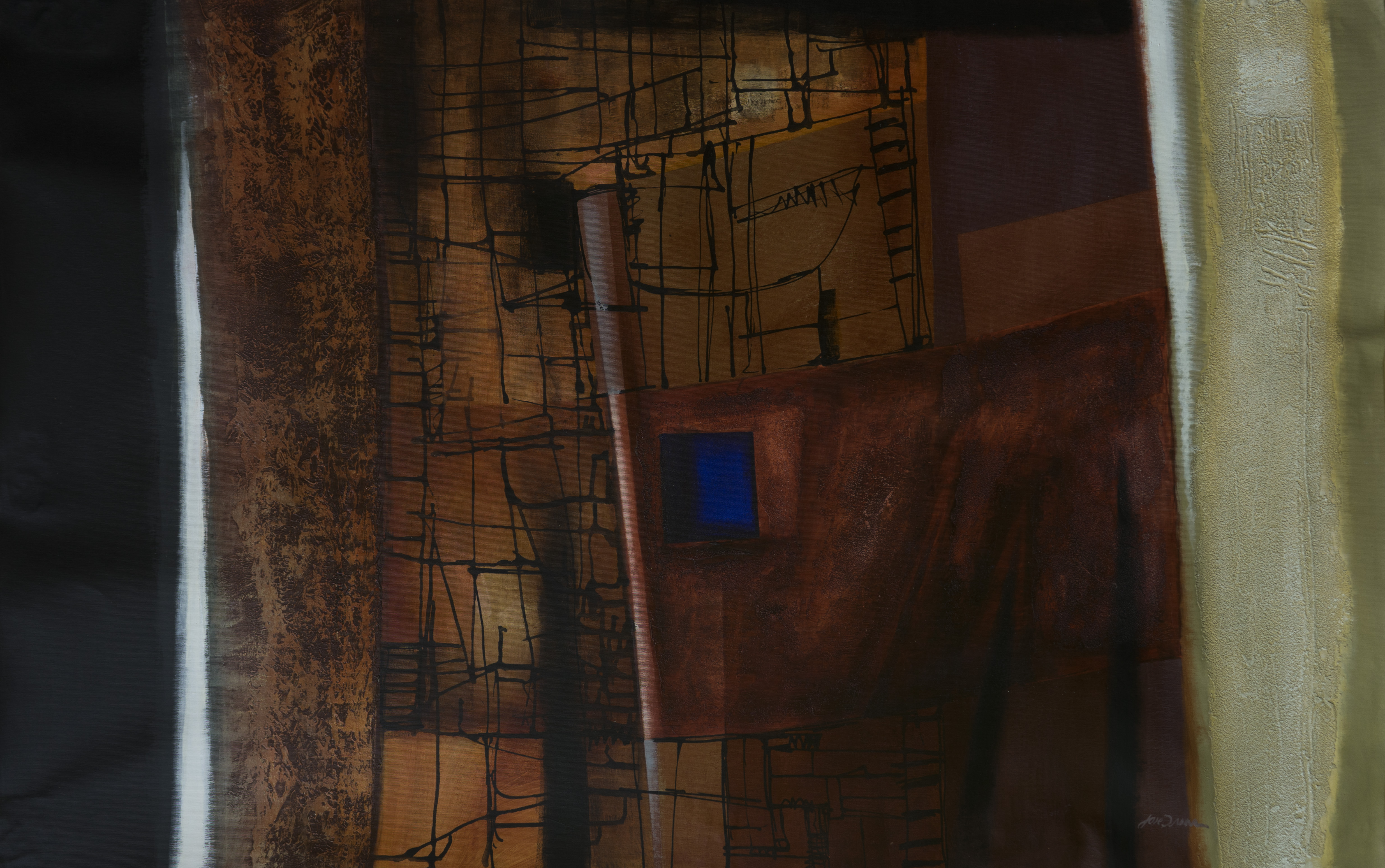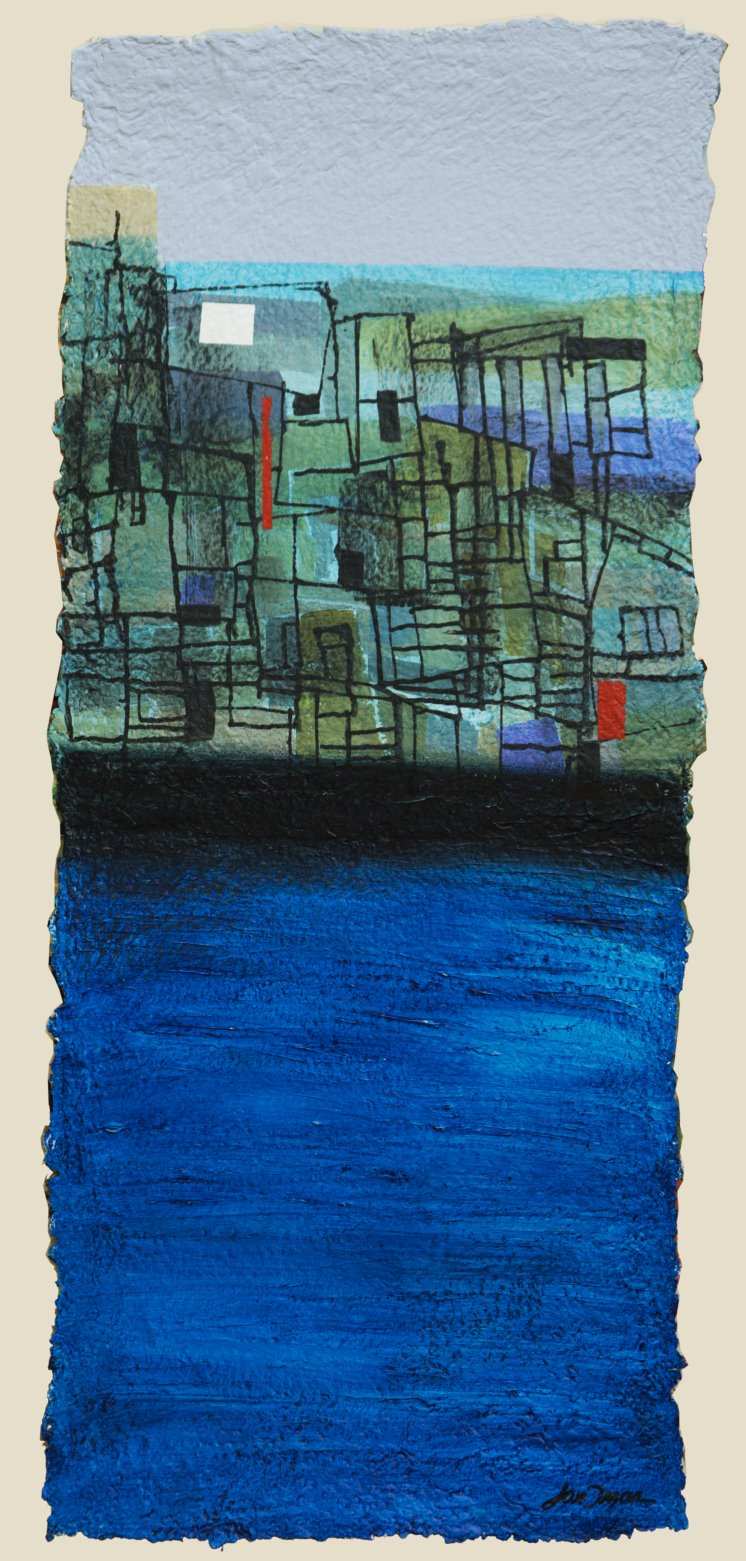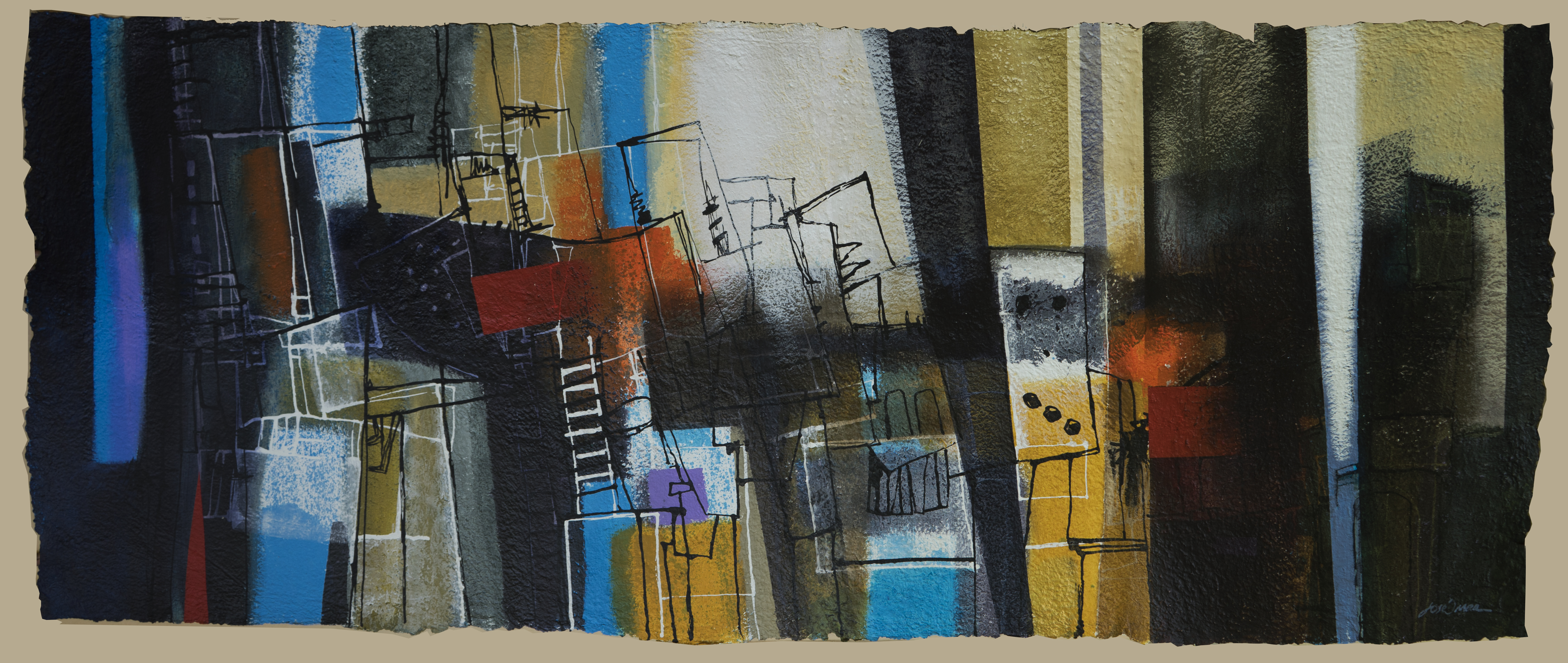 Pintura que de súbito se desmarca de la tela para avanzar sobre el papel hecho a mano, en el cual la textura aporta líneas de apuntalamiento y significación, tal como sucede en obras como Ciudad y Fragmento.