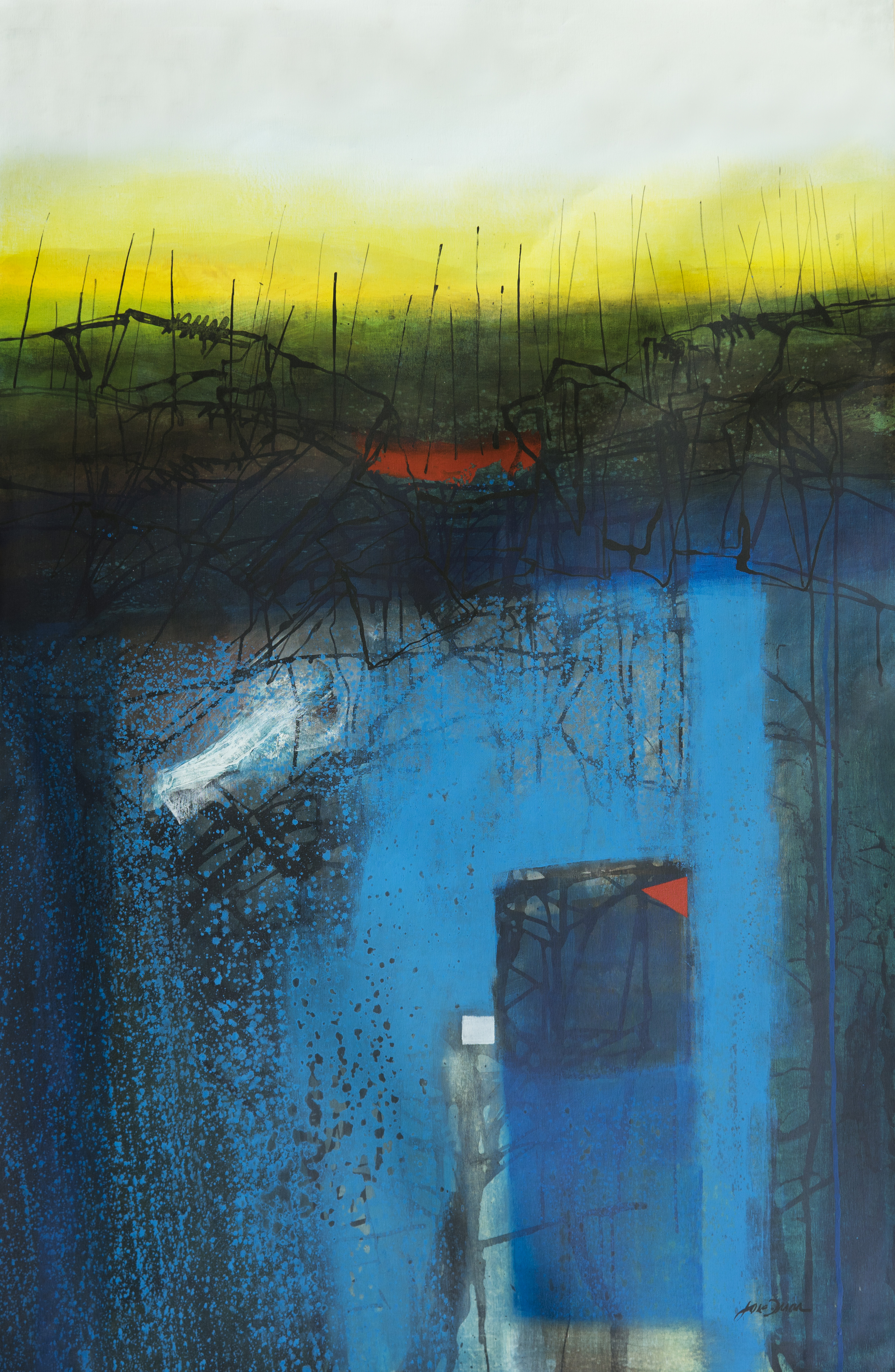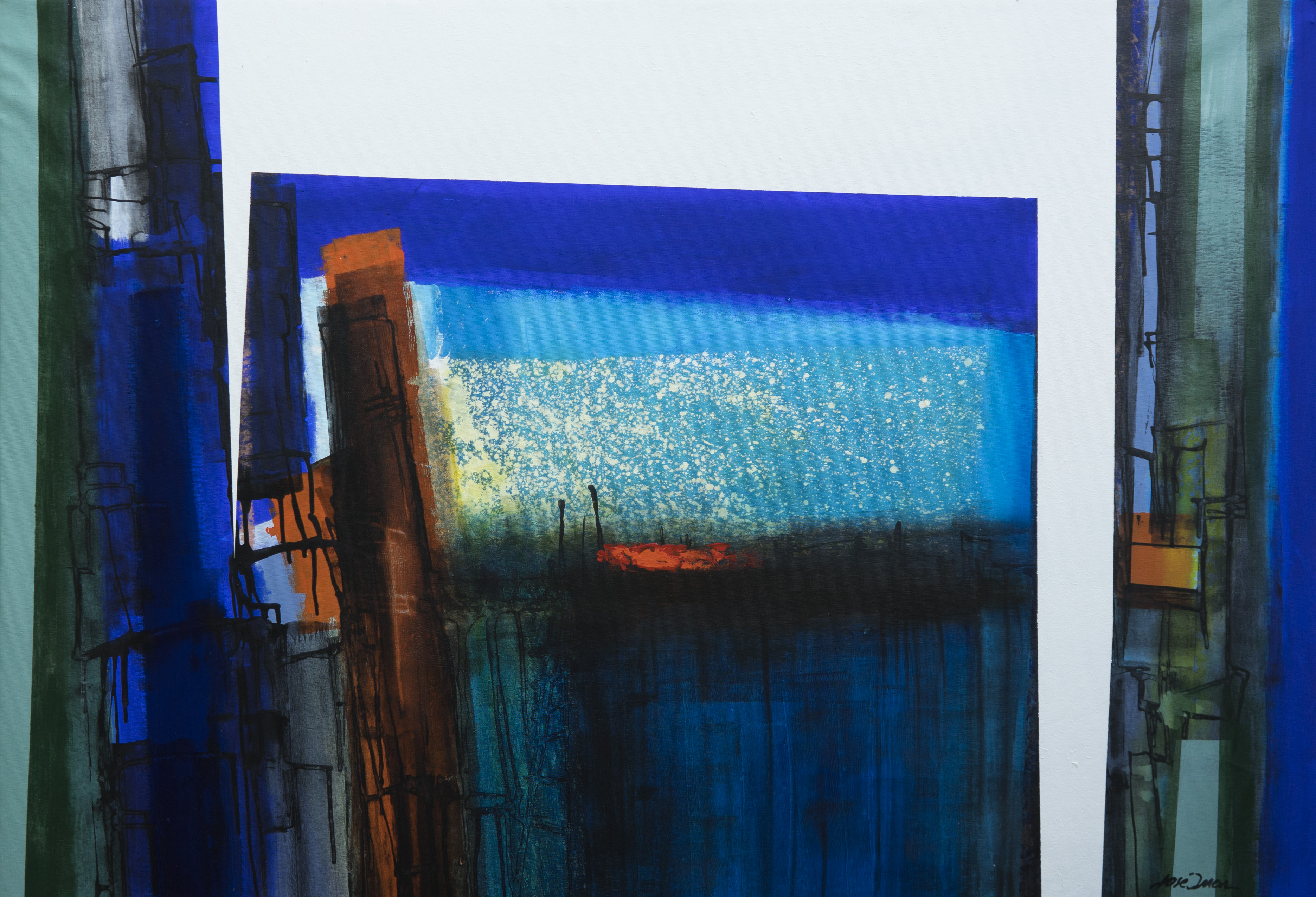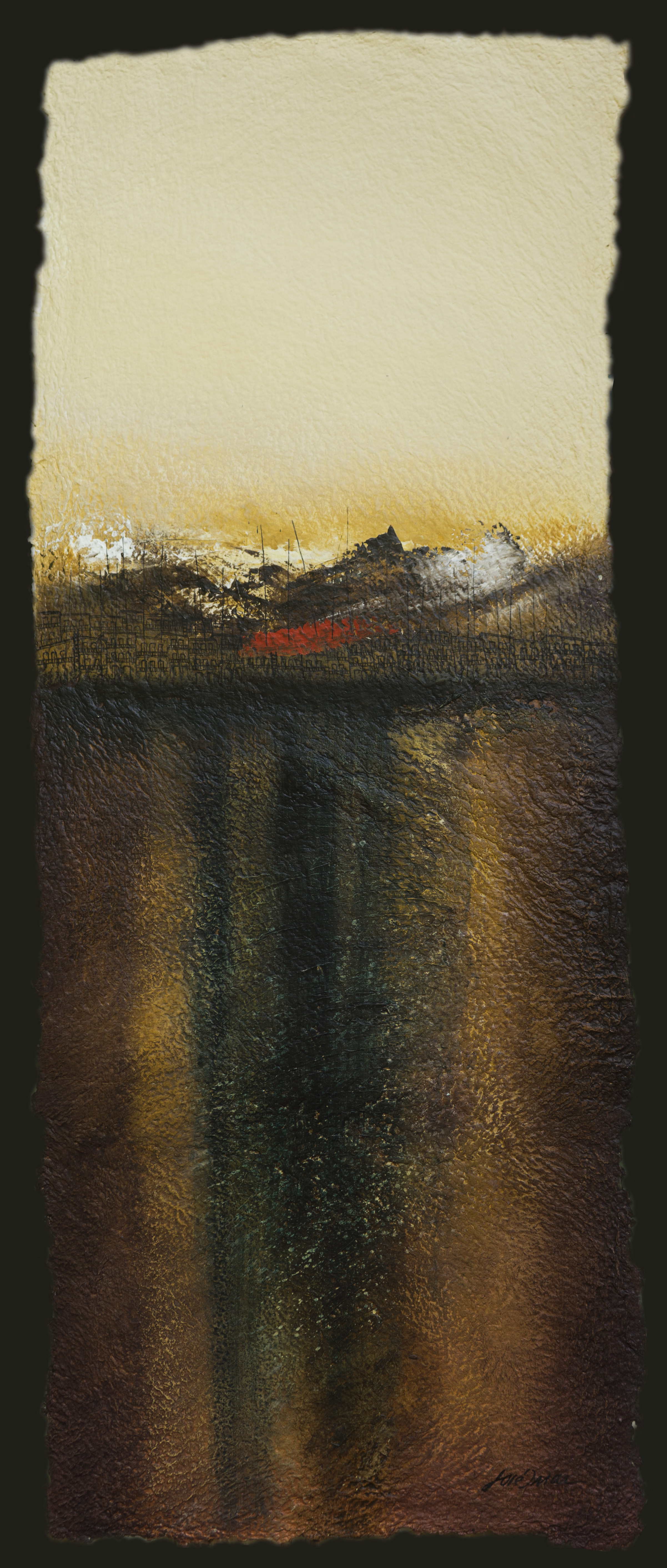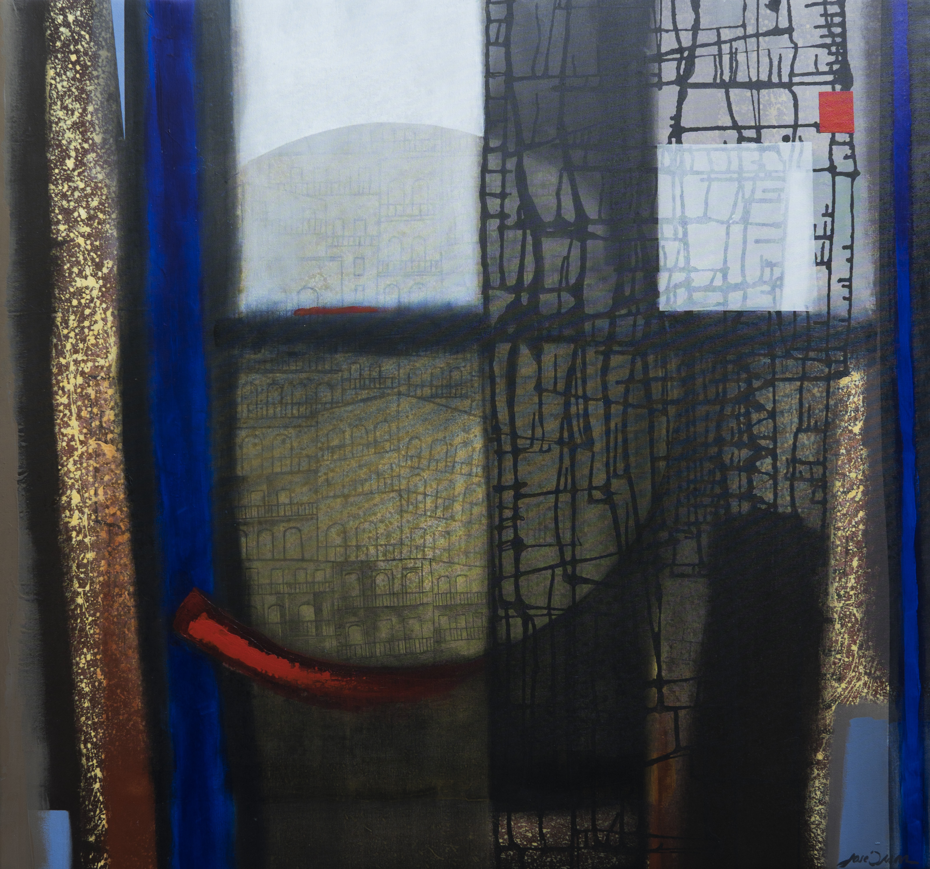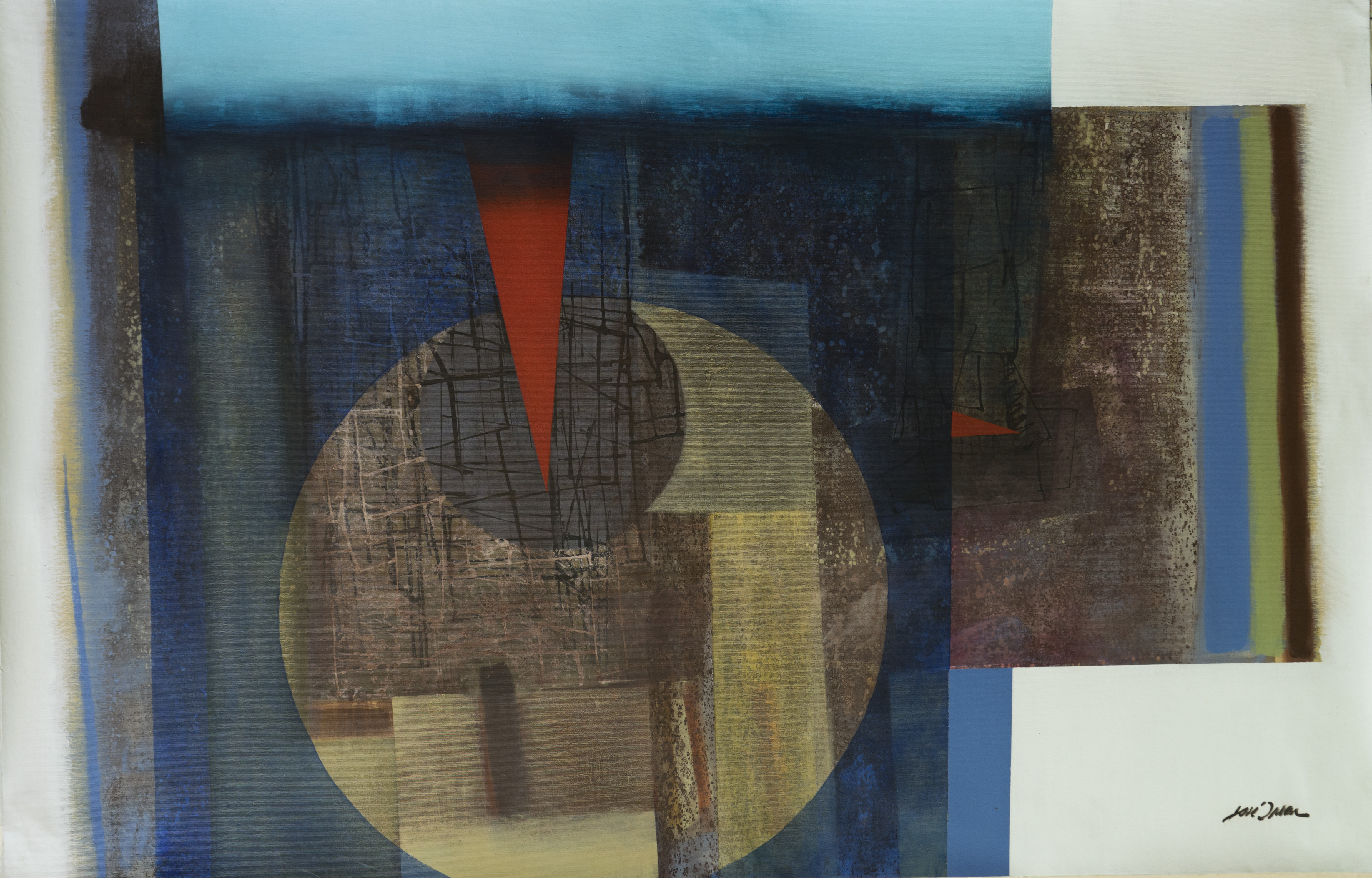 Pintura que de súbito se desmarca de la tela para avanzar sobre el papel hecho a mano, en el cual la textura aporta líneas de apuntalamiento y significación, tal como sucede en obras como Ciudad y Fragmento.