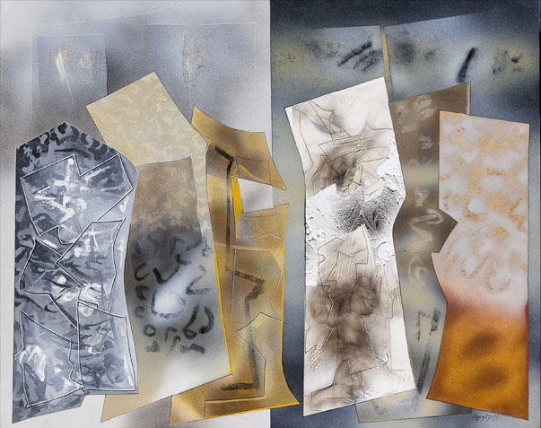 That constant element of his personality as a painter is also present now, though differently, in beautiful paintings (it is no sin to call them that), where the intimate discourse mixes with the environmental perceptions, and where the recognizable is veiled, while the subtle impressions gain considerable form. No one would be doing the right thing if Vázquez Martíns production were to be pigeonholed in any of the moments of irruption and new irruption of abstractionism, whether lyrical, art autre, color painting, post or neo. His style (a term that is not to be discarded, either) skillfully fuses organic with geometrical, order with dissonance, accurate vision with suggestion. It is a language both mixed and syncretic in itself, and provided with a strong load of the pleasure felt when handling the possibilities implied in the work through the materials, instruments and procedures of the craft. This is, precisely, the key to his painting: being, above all things, paintings to be contemplated, responding to his careful sense of elaboration, projecting a hedonism refrained in the channels of art sensibility, and achieving the balance between the impulses of emotion and the almost Cartesian organization of his designs.