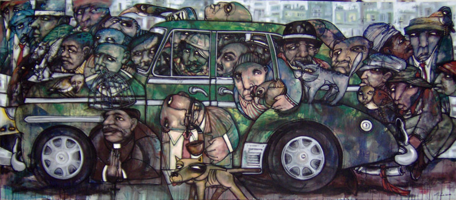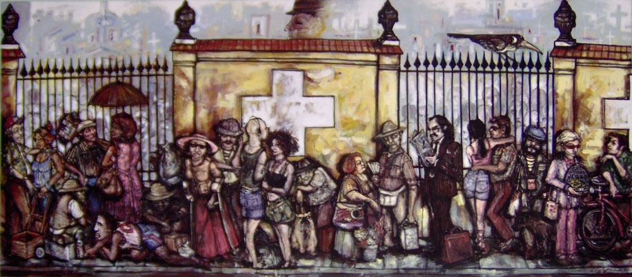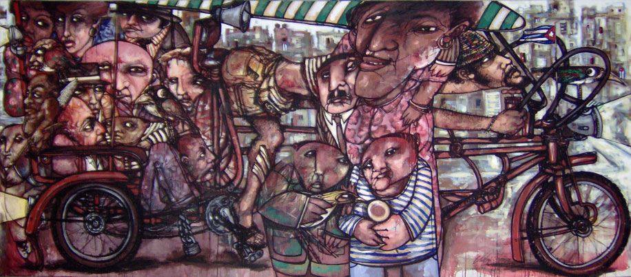 The force of Villafaña’s elaboration lies in the faces, where the eyes and glance become themes underlying his works. Kidnapping of the Old American Car, Inhabitable Space and Last One, Please, are three large canvases showing group actions in which the ethnic and social variety of Cubans are represented. They show the duality of good and evil, true and false and real and invented that is inherent to everything that surrounds us. On this subject, the artist explains: The element eye creates an internal rhythm in the pieces; the study of faces and the expression of the glance help me show the angelical and infernal existing in each person. After a moment of silence facing the works he finally says: Because Paradise may be infernal, and what is pleasurable may also be in hell.