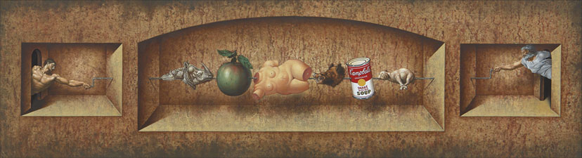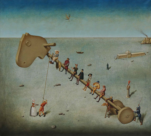 A particular relationship between the human being and time reveals to us the present work of Rubén Alpízar. All that inwardness that survives in the scenes he is constructing has not sufficed him to enlighten us about the dreams we will advocate at all costs, that is why he invites us to a very peculiar tour. As if he were answering Gramsci’s questioning about what man is or, more precisely what could man become, to conclude defining it as the process of his acts, Alpízar faces us with human irrationality in his ironic parody of Creation in Ashes of Paradise. This universal diagnose of his places us in the coordinates of our contemporariness, very close to the destruction of all that has been created.