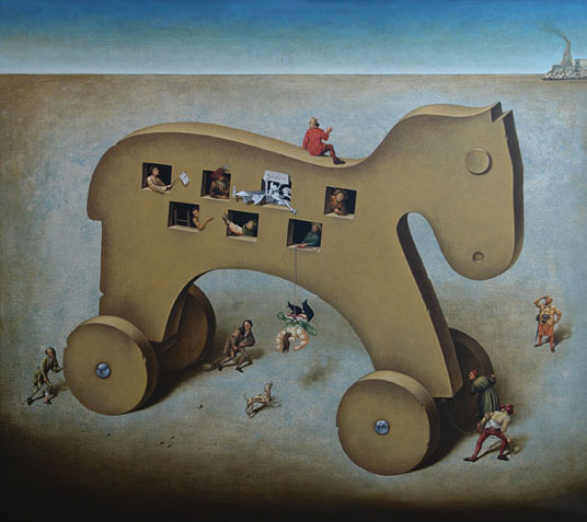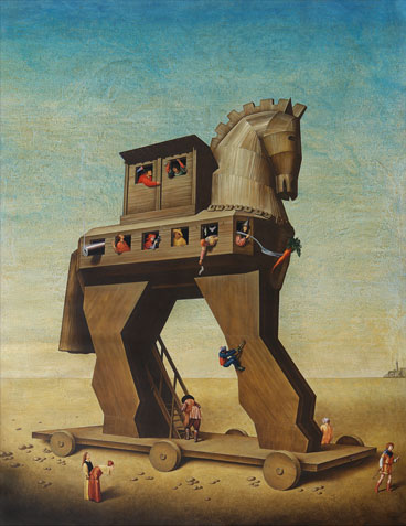 Following that emphatic enunciation, Alpízar begins to present the places inhabited by this intimate reflection. They are compartments where faith or anguish, plenitude or sterility, scorn or freedom, occur. In the end, multiple spaces where he clears up that conscience of himself he wishes to share. We then become witnesses of those panoramic views he illuminates as if he simulated the days in his series Donations with Intrigue, which portrays a proximity that acquaints with the formerly phantasmagoric and alien city where his characters intermingled. Although one of the cardinal borders of that city has fallen, we always recognize it in that vastness of sand where the Trojan horses suspiciously go grazing.