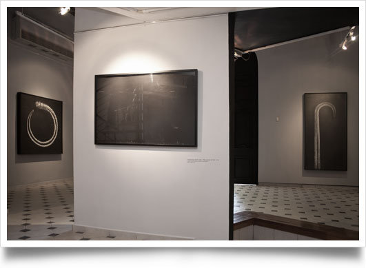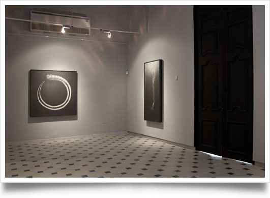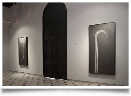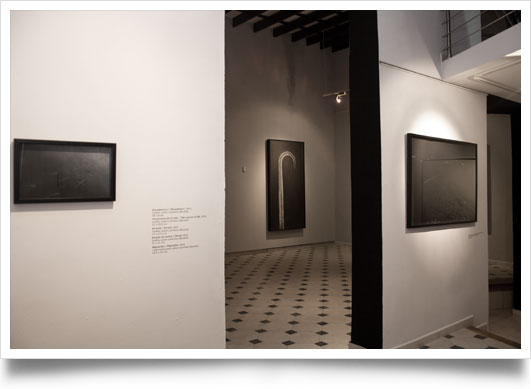 The scenes of this new production refer us to vague environments deprived of any resource of orientation. They are sometimes so impenetrable that they seem to have some analogy with the well-known black holes, and just like these astronomic phenomena they produce the illusion of deducing a series of uncertain routes and destinations. The paintings that make up this series also originate an interesting playful meaning in which both author and spectators may be constantly reordering the points of view, the logical structures of dimension and location. An overview that today is exhibited from one point tomorrow might be located in another, constantly alternating its inductive capacity. It all depends of the levels of reading and the mental situations.