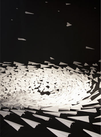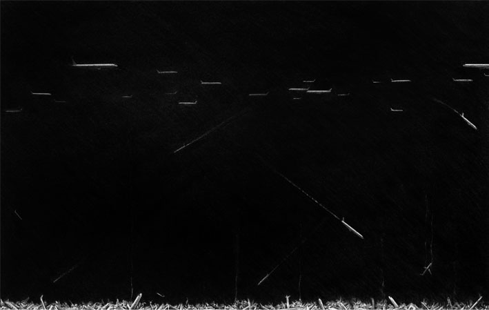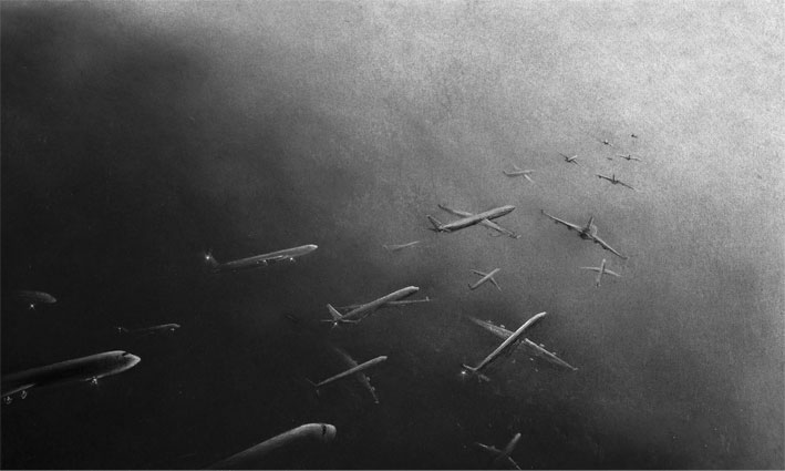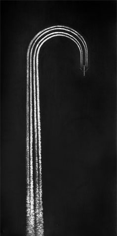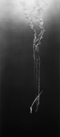 The airplane image refers explicitly to the swiftness of modern life, to the human being dependent of high technologies. But when the airplane image is inserted in those infinite and cosmic places where the notions of direction and altitude are lost and the borders between black and white, light and darkness dissolve (some spectators might think they are night flights); when that image is placed in such an angle that it seems to be observed by an omnipresent eye, then the metaphorical implications of the machine, its meaning in our age remain in the background, and it is the gas expelled by the motors, the detail enhancing the contents that reinforces the discursive meaning of the piece, the one that tells of the modern man with his fleeting existential itineraries, with his sudden ascensions and precipitated falls, events that are extremely difficult to register, to inquire about from the testimonial and symbolical sphere. Hence the figurative use made by LOPEZPARDO of the term Caja negra alluding to those embarrassing living experiences entailed at present by the majority of ratification or evidencing processes.