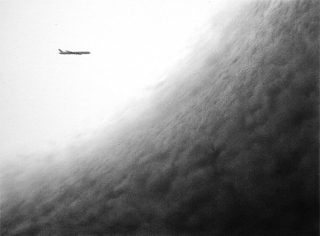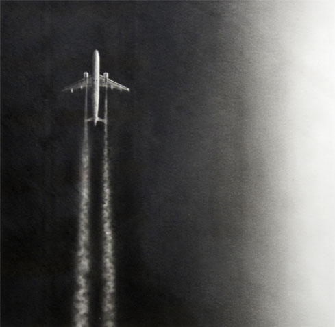 The change of atmosphere that goes from earthly to aerial, from secular to cosmic and the penchant toward a metaphor that is less dependent of the own country are the first signs that stand out in Caja negra. A change already induced in previous groups of works, but now emphasized with new codes and compositional suggestions and boosting particularly the image of the aircraft, a resource repeatedly used by our plastic artists both bi-dimensionally and volumetrically in different art forms (why refuse that privilege granted us by the perpetual insularity?), but still not exhausting its many representative and allegorical pretexts True that the airplane was premiered symbolically in the piece Avistamiento II (study) from 2006, but its leading role now displaces the telluric airs of his best-known painting, reducing a bit the rural mysticism and increasing the observation, all of which grants his work a somewhat more socializing and ecumenical nature.