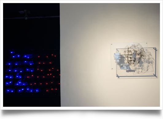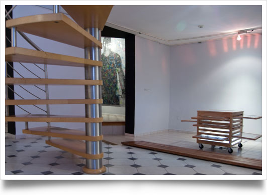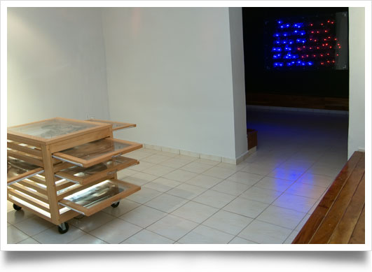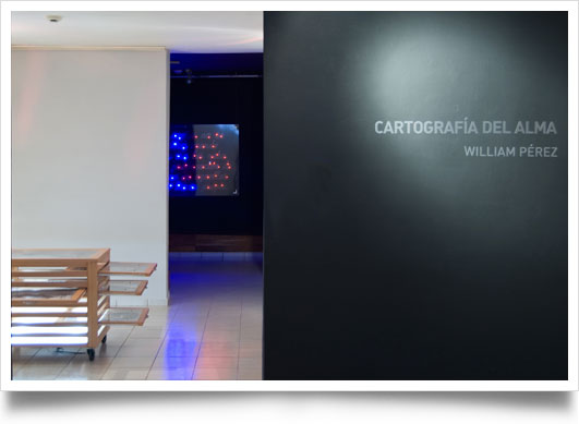 In a semi-sphere where a much larger plane chart has been drawn, William is seen sitting in Northern Africa with strange apparatuses on his legs, thus becoming one of his favorite characters: Forrest Gump. The evocation of the much-awarded film by Robert Zemeckis (1994) played by Tom Hanks mixes with his own ideas related with the human will and the essential it is to consider purposes tht mold our lives. Because almost all the pieces in this exhibition tell us of the will, of the purpose, of the dreams that guide us, and of the perseverance to achieve them. And this group of ideas, reflected in texts and images, forms a unit with the materials and the form of working them. The transparence and luminosity of these sculptures show the essential sense of the pieces. In turn, the form of disclosing the entire supporting structure and the connection of the physical components grant that air of clearness and lucidness in accordance with the self-reflexive tone of the exhibition.