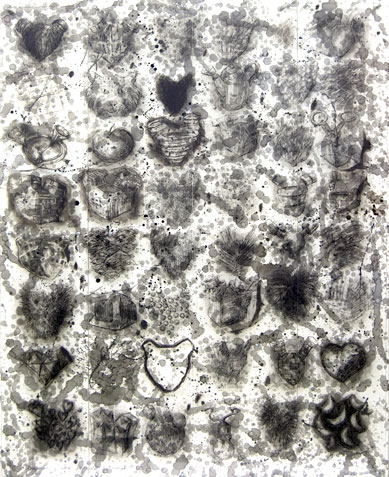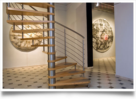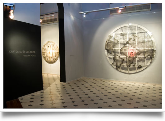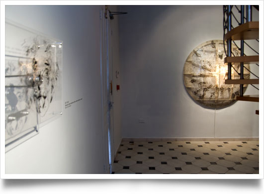 That new present geography springs at us from the moment we enter his ample workshop, constructed with such difficulties: they are transparences, lights, delicate sgraffito drawings and photographs printed on vinyl that assault us today. Circular forms resembling planets abound in the still unfinished pieces, indicating perhaps that the artist has arrived at that point in which one glances from a higher level, beyond the simple human stature, to see what may be happening in a topographic and existential surrounding extended to the entire human genre. And he himself, his silhouette and image, come out profusely to meet the new works, in the fashion of an idea of himself that is like a form of thinking about all of us.