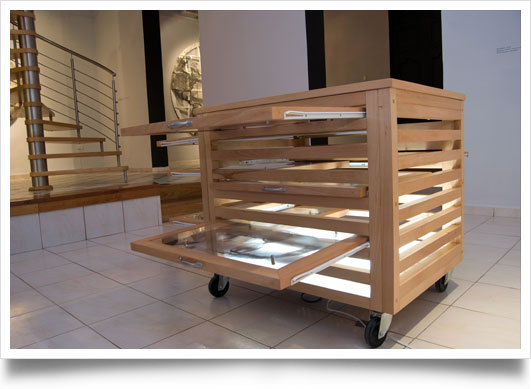 Secreter (Writing Desk) is a piece worthy of its linguistic lineage. Digital photographs belonging to all the stages of the artist’s life may be seen printed on vinyl inside a furniture piece halfway between the private desk and the professional drawer file destined to conserve works on paper. When the wooden-framed Plexiglas compartments are opened, a true visual autobiography is discovered while we see photos that go from the showy long-haired boy to the serious sculptor who today wears glasses. And an inner light illuminates the entire file to end, on the surface, with the drawing of a simple turtle, dear toy from his childhood.