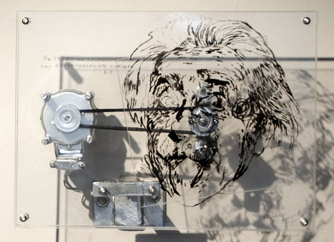 The piece En todas partes (Everywhere) is a convex, transparent semi-sphere, also illuminated from inside, that William has drawn by sgraffiting the Plexiglas to later fill in the very fine grooves with color. He imitates the world and many Williams appear in it, in diverse poses, doing we don’t know what, but feeling as if at home anywhere. An overflowing of the sense of living beyond the sacrosanct point in which we were accidentally born seems to attract the sculptor, who feels equally gratified in all parts of this transparent world, full of slight intimate allusions and minimum geographic clues.