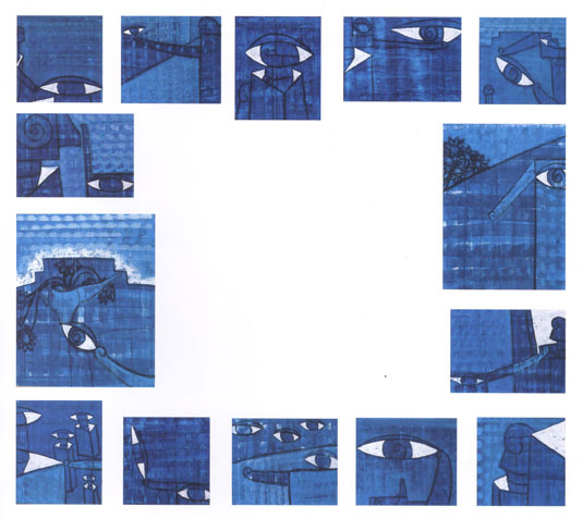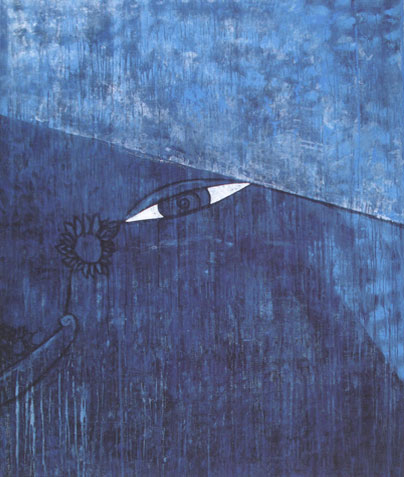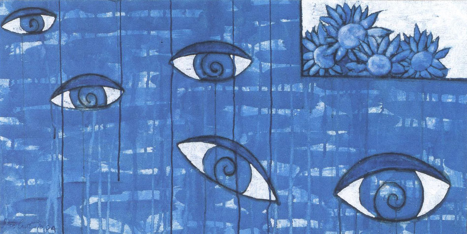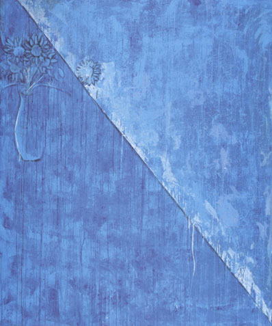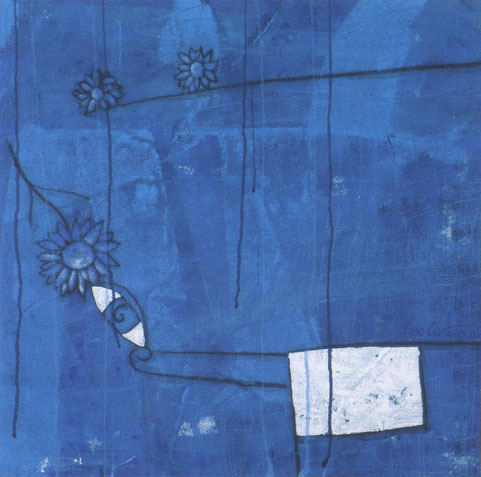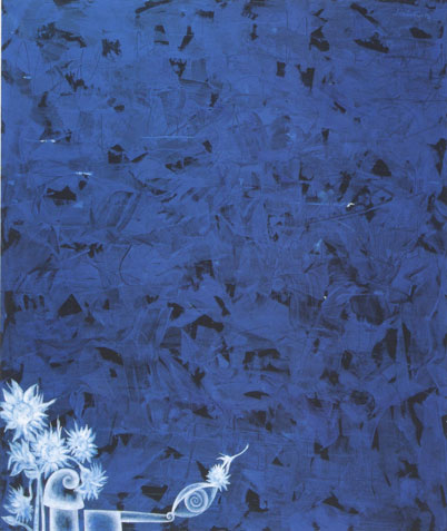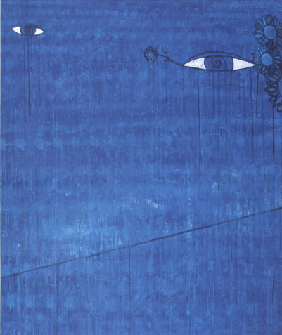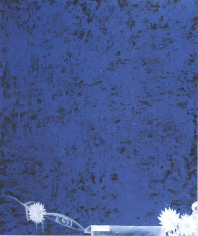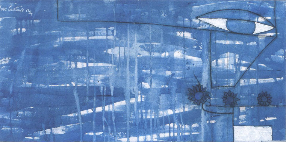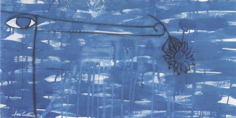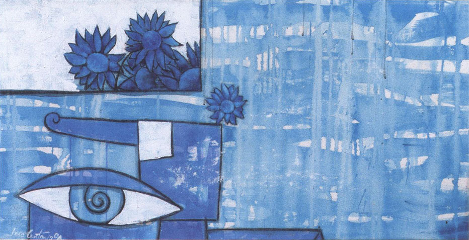 Amid these general keys to JA’s poetics emerge blues and more blues, José Antonio’s blues, blues for the devil, now transformed in the chromatic ingenuity of the palimpsest or covered by an equivocal simplicity, since just the way it occurs in the very well-known jazz piece Blue Skies, where the theme goes from piano to drum and from there to the mute trumpet in this case the subject is divided, atomized and put in concrete form in each one of the fragmented canvases in which symbols, winks and complicities are displayed, playfully and definitely trapped in the emphatic painting effect of José Antonio’s blues.