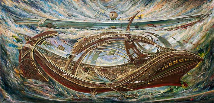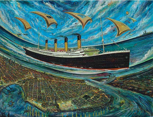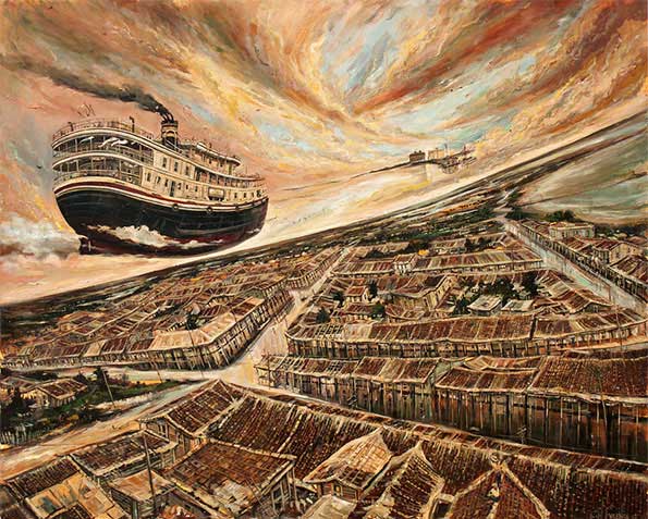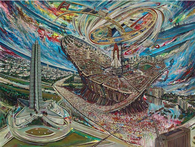 Si algo emerge con asiduidad en sus trabajos es, en primer lugar, el amor por su terruño natal: Batabanó. Ese pequeño y olvidado pueblo al Sur de la capital, bañado por el Caribe, es el centro de la Tierra, del mundo y de sus obras. Allí nacieron él y sus pinturas. Por más que se acumulen elementos en el lienzo, y lugares conocidos e inventados, artefactos, medios de transportes, gentes -ese lugar aparecerá de mil y unas formas en las pinturas.