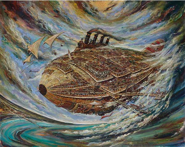 Entre las sensaciones que embargan al espectador, hay una que sobresale y es que al mirar sus cuadros uno sabe que el Tiempo se ha detenido allí, un proceso que no va al paso con la contemporaneidad que es tan agitada, siempre en movimiento. Es como si no pasara -¡aparentemente!- reafirma el creador, porque detrás todo gira, se agita. Solo hay que ver el viento que a tropel cruza por los lienzos envueltos en esas gamas de colores tan personal que lo identifica siempre: fríos y cálidos que se complementan y fluyen desde el centro hacia fuera del «semicírculo», y ese aire de tormenta que le recuerda aquellos ciclones que batían sin cesar las indefensas costas del puerto del surgidero de Batabanó que nunca lo abandona. Precisamente, para no olvidar pinta y construye desde sus telas los recuerdos de lo que fue. Es su Macondo (real) «no muy surrealista» como el mismo infiere; más bien literatura pintada que roza el surrealismo. Cual arquitecto, Vicente Hernández delinea las calles de su pueblo natal en medio de ¿La Habana? u otra ciudad que puede llegar inventada o enriquecida por otras construcciones «extrañas» llegadas de otra latitud que puede ser también la mental.