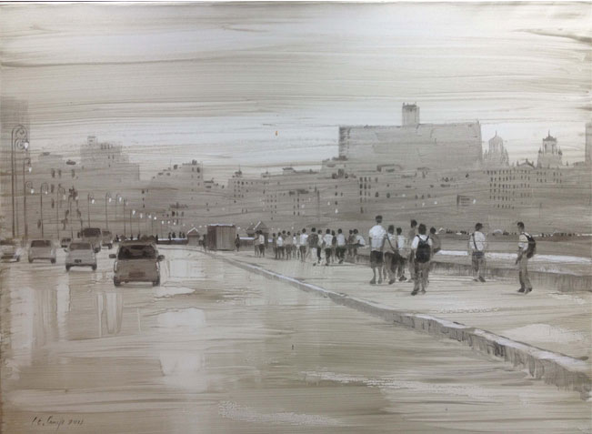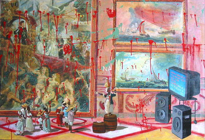 It has certainly been harmful that the lack of roads, of references, contaminated painting with a detrimental reiteration, and that certain learning processes and a narrow field of cultural vision and background have been burdening Cuban painting for years. A well-known effect is the reduction of aesthetic variables with the pretext of quoting or rescuing painting styles and periods, multiplying commonplaces, as well as ignoring valuable painting discoveries, in terms of composition and style, that are being performed today in the world. And in them is the formal experimentation that is liberated in daring gestures, freedom of expression and in the use of color and adding of different references. Also in experimenting concepts why not? In the use of expression resources like humor, parody, the game, and in making new interpretations of dissimilar historical and art sources.