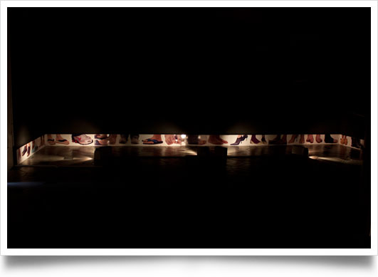 Rodapiés es el título de la más reciente muestra que Lidzie Alvisa presentara en la Galería Villa Manuela en Mayo del 2011. Sin caer en comentarios pretenciosos y absolutistas bastante frecuentes a la hora de definir los llamados momentos en la carrera de algún artista, podemos decir que esta exposición representa una continuidad temática y formal con los trabajos antes realizados por esta creadora. Ha convertido al cuerpo en figura esencial de su quehacer fotográfico. Imágenes caracterizadas por el par dicotómico Eros-Thánatos. Eros que se reconoce, en el propio cuerpo, concebido como ejemplo de la vida y Thánatos encarnado en cualquier material opuesto a la vitalidad de lo humano. En trabajos anteriores esta idea era representada a través de los alfileres que ya se había convertido en recurso distintivo de sus trabajos. La obra de Lidzie es una ejemplificación de un ciclo completo, en la que se ponen en juego elementos de significación opuesta que se interrelacionan entre sí; donde el arte viene a funcionar como momento de tregua o campo de batalla, según sea el caso. Lidzie tiene una clara preferencia por el metal. La evolución de su obra ha sido un poco como la evolución humana. En el principio el hombre usaba la madera para fabricar sus herramientas de trabajo, asimismo ella quedo fascinada por las posibilidades expresivas de este material, luego descubrió el metal, más fuerte, más resistente y la humanidad entró en otro estadío. Así mismo la obra de Lidzie entró en una nueva faceta cuando comenzó a realizar indagaciones donde el cuerpo, muchas veces el propio, es invadido, agredido y por qué no también embellecido con los alfileres. Como parte de esta búsqueda que involucraba cuerpo-metal aparece una fotografía, me atrevo a decir, crucial en lo que ha sido su trabajo posterior. Carrera de triple filo realizada en el 2007 es una foto que abre la brecha a este tipo de trabajo, también fotográfico donde los pies son los absolutos protagonistas.