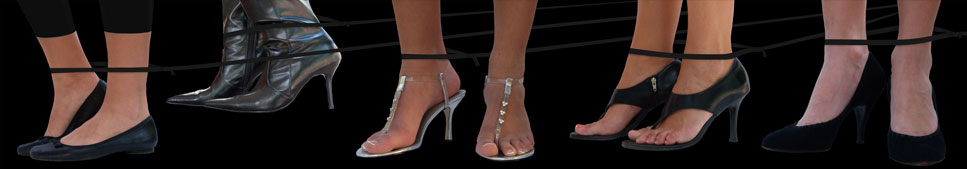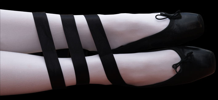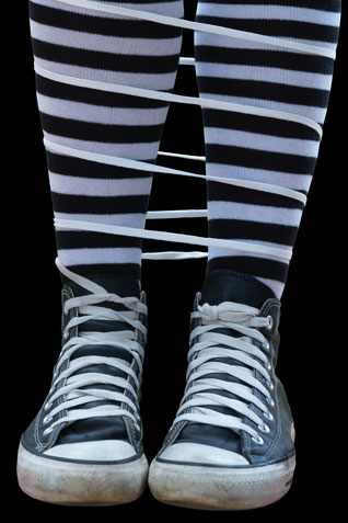 Pero la idea de las imposibilidades se explicita en un elemento que se repite en las fotografías y que es el amarre. Ya sean cordones o cintas, estos aparecen rodeando los pies y piernas del retratado. Además de las zapatillas y de los tenis marca Converse, también aparecen unos zapatos de tacón alto de los que salen unas tiras que envuelven las piernas. Llama la atención igualmente el hecho de que los pies, a los cuales les es inherente el movimiento, aparezcan estatizados por medio de la fotografía.