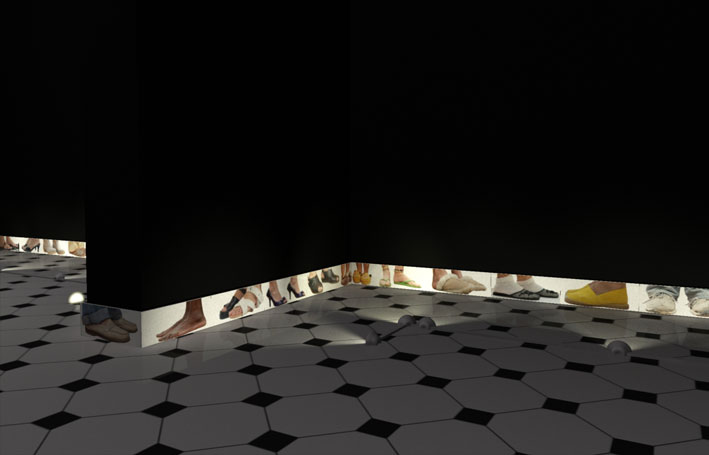 La fotografía es la manifestación de excelencia y por supuesto no deja de experimentar, que es uno de sus placeres en el ámbito de la creación. Imprime en lozas 120 fotografías de pies, que han sido colocadas a nivel del piso simulando un rodapié  real-. Las imágenes muestran los pies en distintas direcciones, con o sin zapatos, e incluso llama la atención la diversidad de calzados que usan los individuos fotografiados. Los pies dan la idea del camino recorrido, determinado por elecciones propias o ajenas, pero elecciones, al fin y al cabo. También afloran otras aristas conceptuales que han sido exploradas por la artista. Aunque siempre se le ha concedido mayor jerarquía al rostro como la parte de la anatomía del hombre que es capaz de dar con mayor fidelidad rasgos de la personalidad, los pies, e igualmente los zapatos, pueden aportar información acerca de la procedencia cultural del individuo, o del estatus económico, por ejemplo. Aunque no es menos cierto que la artista hace énfasis en determinadas tipo de calzado asociadas a culturas o posiciones económicas específicas, incluso a actividades o momentos del desarrollo humano muy particulares. Reconocemos pues la experiencia del anciano frente a la ingenuidad infantil, la vanidad de algunos, el pragmatismo de otros. Posiblemente, hasta sin quererlo, la pieza tienen un carácter sociológico pues es capaz de establecer una caracterización de los individuos y establecer tipologías y tendencias estéticas de preferencia.