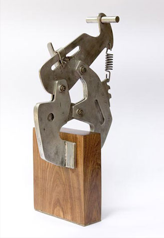 On the contrary, in the neighboring proposal by Rafael Consuegra stand out other qualities. The most immediate one is the ludicrous proclivity to the insinuation of opposite meanings underlying in that intricate communion of plates, cylinders and tensors that create such peculiar self portrait. His opposition to any visual predisposition that reveals itself as authoritarian and severe jumps to the eye; in this work we perceive by intuition a posture of systematic questioning, of uninhibited attitude of subversion before any hint of immobility intended to become permanent.