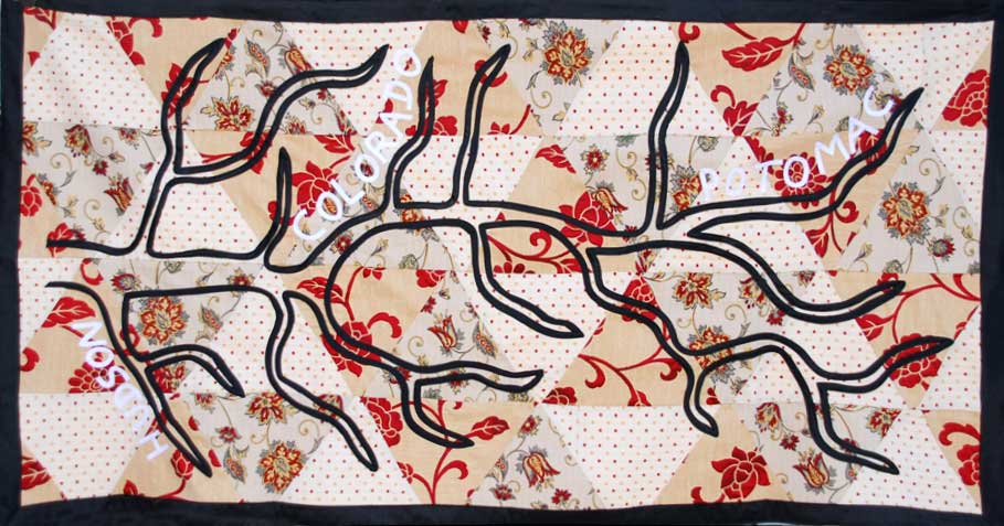 That coming and going from the city to the forest, from the outer to the inner world, is the road he chooses with his art. The constant journey to authenticity summarizes his work in the most recent years. His roads? The earth we live in: the main idea and its tributaries, like the rivers that show changing colors. The art returns to the project Cubrecamas (Bedspreads) which he started in 1997, drawing similar silhouettes of rivers but the same volume and similar tributaries. His rivers, which are the routes that flow into his life, are also the essential idea of the serigraph Los pasos perdidos (The Lost Steps). A man who tattoos a river on his face, his own life whose premonition he has predestination or fate?