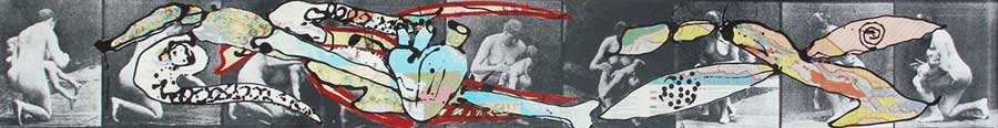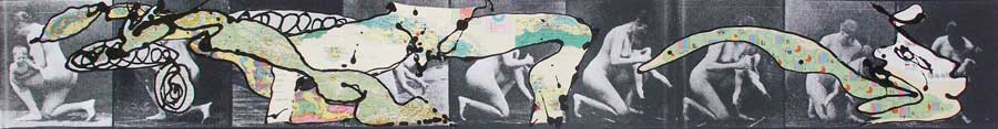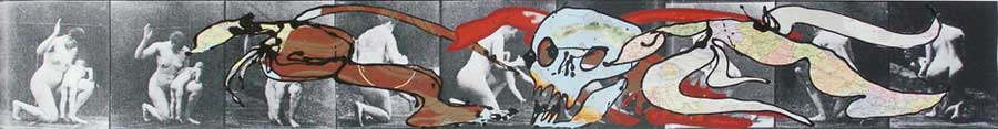 The Series Punishment made from a test photograph from the 1920s where an image is captured from 360º reveals the action of a mother beating her son. Both naked, both with nothing to hide and exhibiting only the pain of the reprimand. The nudity of the flagellation becomes a psychotic and sensual action. On top of the mother that uninterruptedly beats that son, between the pain of the tears anticipated in both, the artist has superimposed maps of the Island of Cuba in which diverse parts or organs of the human being are being removed to the outside once more the inside and the outside. The map of Cuba over the naked mother that beats her son and the heart on the outside: the Island beats the son. The mother that continues beating the son and the brain on the outside: the son neither feels nor suffers already. And thus the head extinguishes, the word overflows and finally swallows or spits the Island, depending on how we interpret it. All the exposed vital organs turn the presumed human being into a snail, viscous, slow, brutalized animal that attempts to lick all the pain and take the Island upon itself.