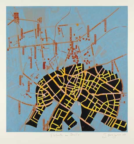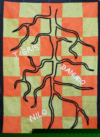 The rivers, like the animals imagined by Ibrahim, are limits, planes in the geographical space, walls between nature and man. The river has its own life and with its powerful central nerve does not allow man to modify its course. The cartographical tracings are also spatial limits. The artist does not invite us to break those demarcations, but rather to develop the most powerful imagination, still within the terms imposed by society and civilization. The elephants, horses and elks walk in the cities, the rivers flow through the land we step on and become fixed thoughts. Rivers like leaf veins; animals as if in relief within the world map are the discoveries made by the artist in the environment we live in. He shows them to us, in addition, full of exuberance, to feed our imagination with brightness and colorfulness.