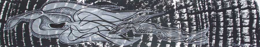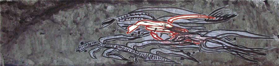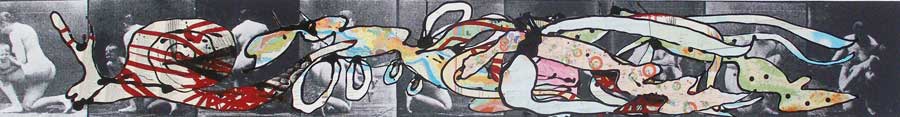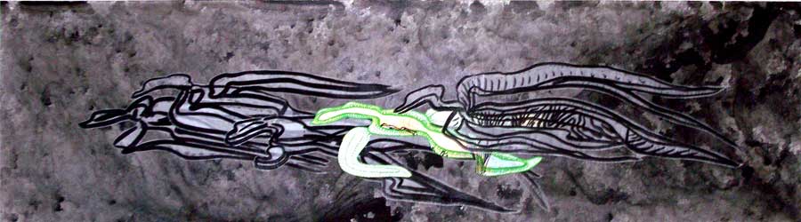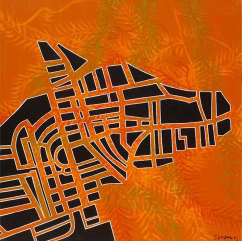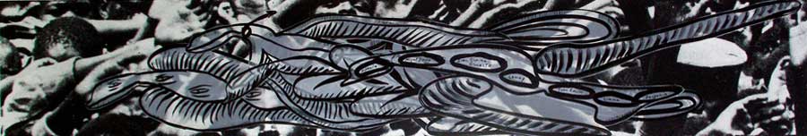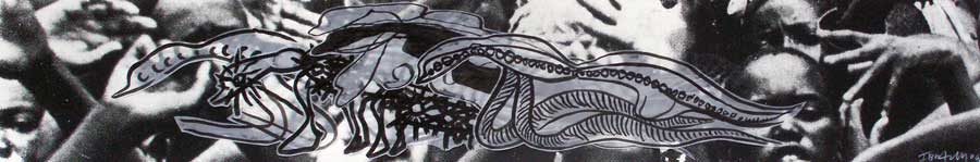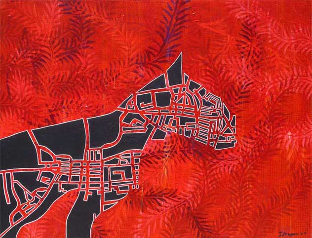 The splitting into rivers, tributaries, animals, maps, punishments and captivities are routes in which Ibrahim Miranda searches and recognizes his self. Carpentier’s journey to the core of mankind, without civilizing artifices, is also the journey of Ibrahim Miranda’s work toward the inner understanding. And to get there he has as many roads as powerful are his imagination and artistic sense. From the extravagant and open color, the textile, the collage, the serigraph, the engraving, the acrylic on fabric with which he states his alternative ways, his necessary tours, to the whites and blacks of the pain series.
