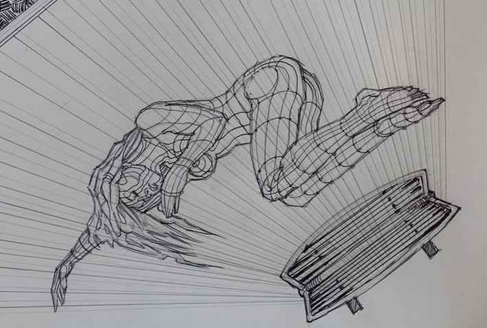 Installation (Sketch) Cotton thread, artificial silk, tensors and steel cables. Ultraviolet light. 260 x 170 x 100 cm